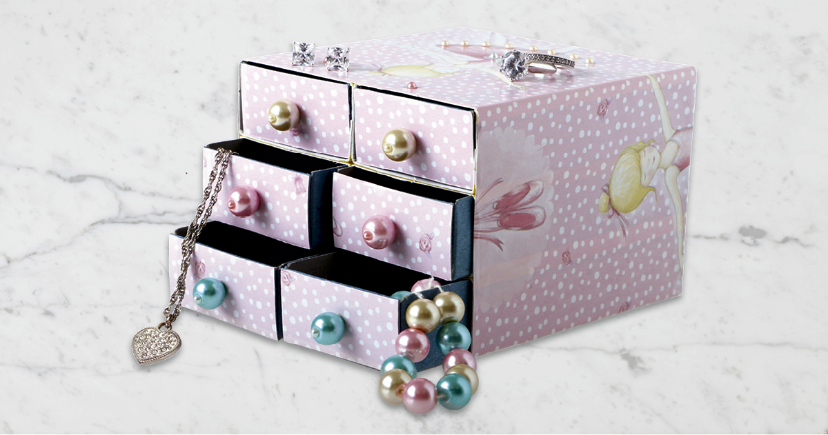 - Glue the pairs of boxes together at their sides, then glue the three sets on top of one another, so that it looks like a little chest of drawers.