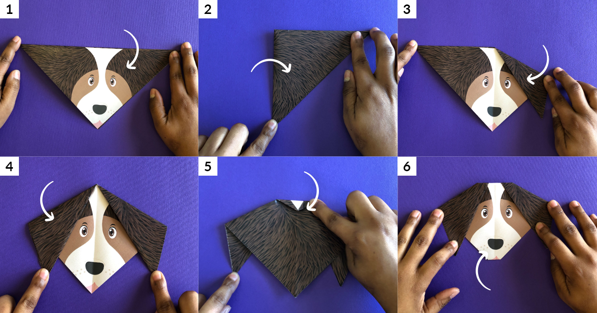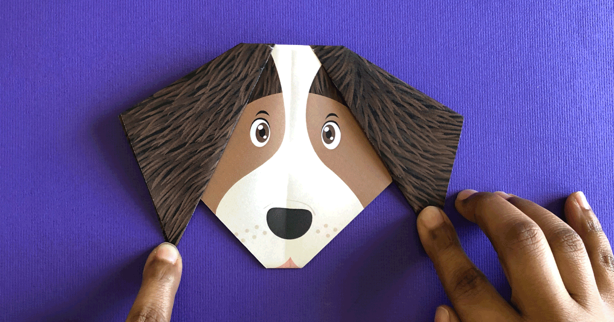 Fold the right-hand tip down over the dog’s face to make an ear.