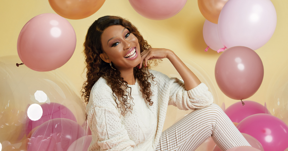 In studio, surrounded by balloons against a champagne backdrop, it’s no surprise that Kgomotso is completely at home in front of the camera – and she is charm personified, with a warm personality and infectious smile.