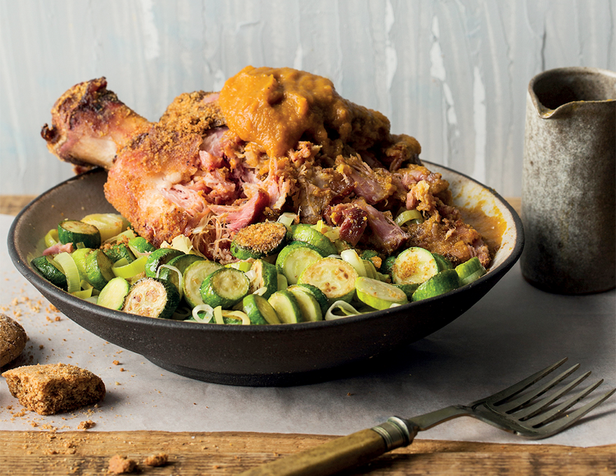 - Cut away the top layer of skin on the pork (serve it on the side as pork crackling) and sprinkle with the ginger biscuit crumbs. Roast for another 15 minutes.