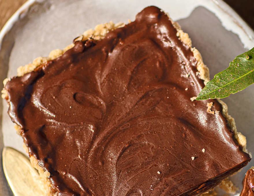 For the chocolate, whisk the melted chocolate and oil together, and pour it over the caramel layer, smoothing it over with a knife. - Once even, swirl the chocolate slightly for decoration and refrigerate, until set, before cutting into slices.